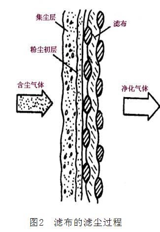 袋式除塵器的除塵過程主要在過濾室內由濾袋來完成,濾袋由各種纖維織成布后縫制而成。除塵器濾袋凈化空氣的機理取決于濾袋和粉塵層的多種過濾效應,其凈化空氣的過程如圖1所示。