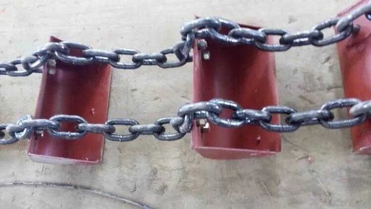 環鏈是較常用的一種牽引件,它的結構和制造比較簡單,與料料的鏈接也很牢固。但環鏈相互接觸處易磨損,降低鏈的強度,且運行不夠平穩。